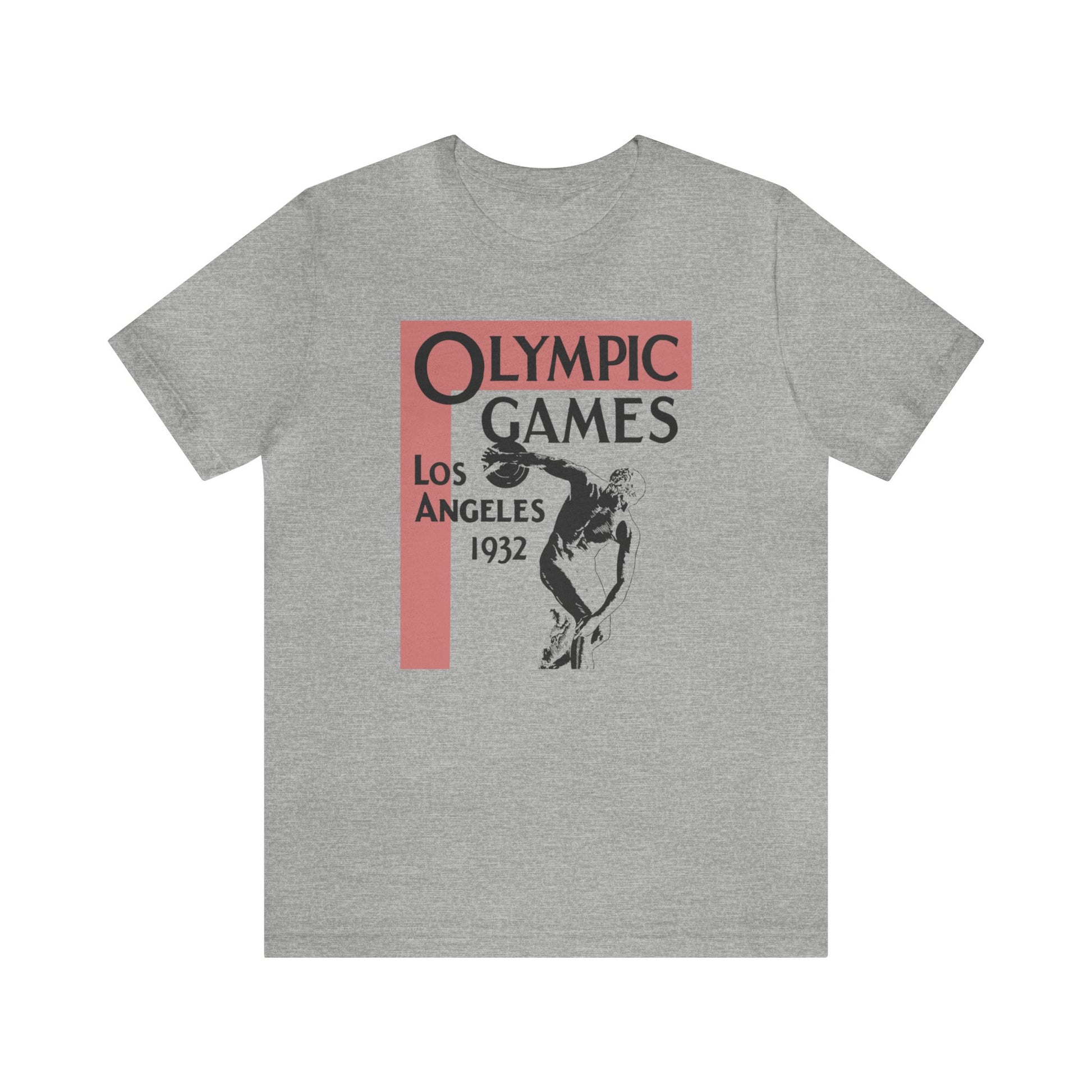 A classic discus thrower image highlights our 1932 Los Angeles Olympics t-shirt. The Games return to LA in 2028. Printed on our super soft and remarkably comfortable combed and ring spun cotton tees.