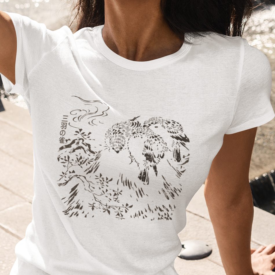 We repurposed a century old image by Miyazaki Yuzen for our Three Sparrows design. The birds may seem hidden at first, but are located in the upper right quadrant. Printed on our super soft and incredibly comfortable combed and ring spun cotton tees.