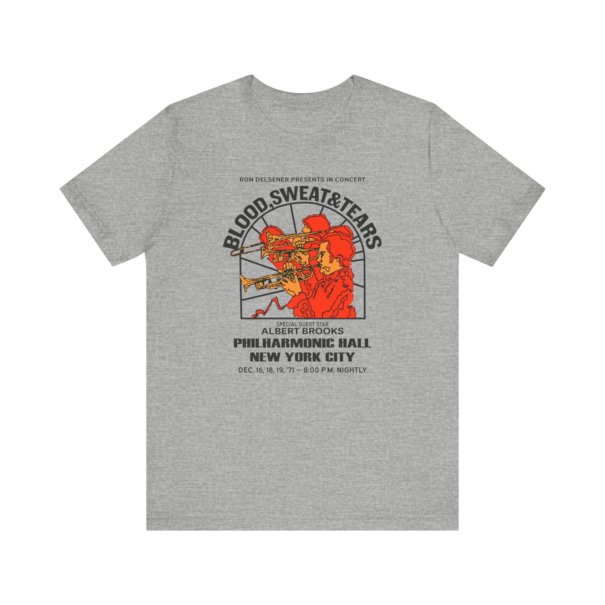 Our Blood Sweat & Tears t-shirt commemorates the 1971 concert by the popular jazz rock group at Philharmonic Hall in NYC. How about Albert Brooks as the opening act? Printed on our incredibly soft and amazingly comfortable combed and ring spun cotton tees.