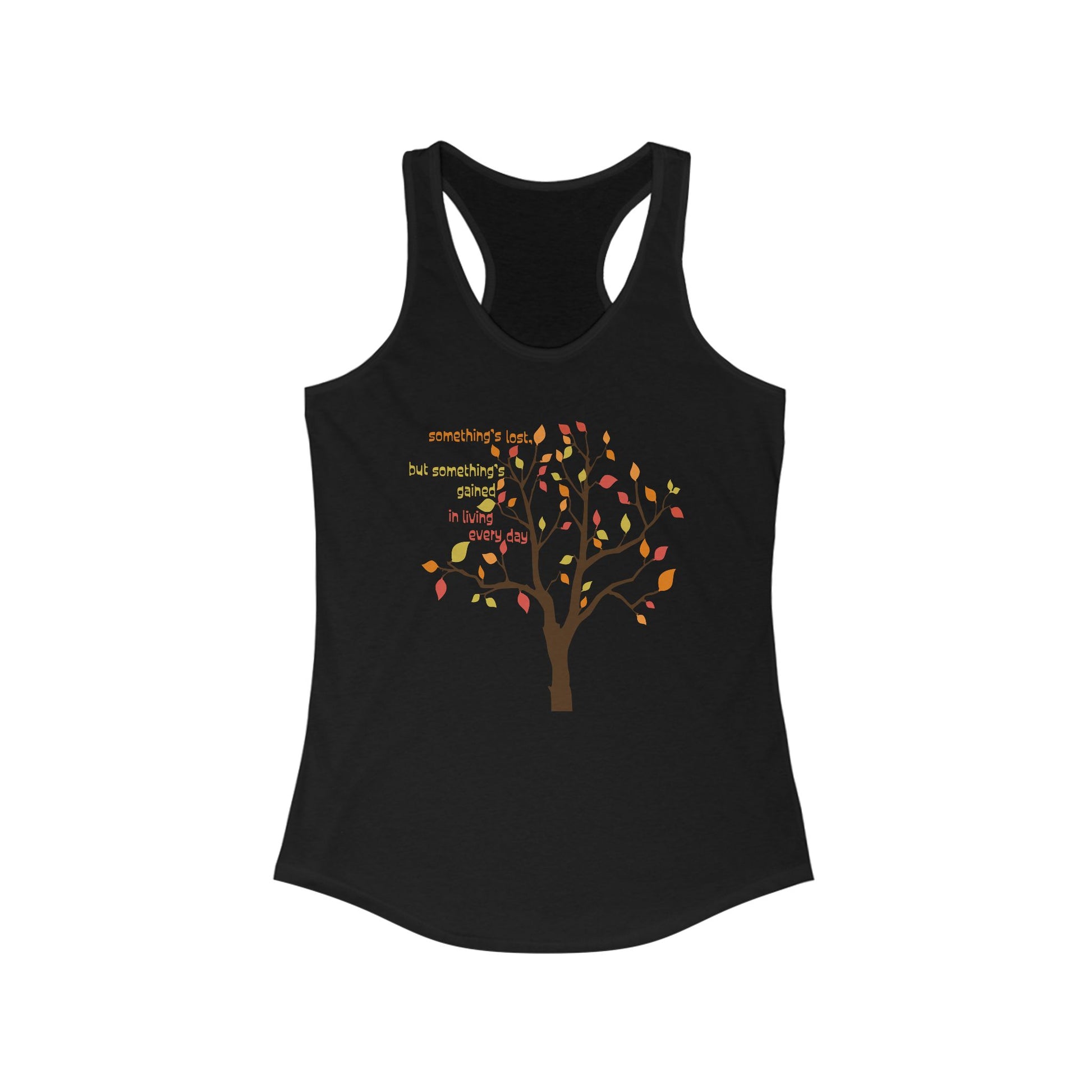 We combined a line from the Joni Mitchell genuine classic - "something's lost, but something's gained in living every day" - with an image of an autumn tree to create our Both Sides Now tank top design.