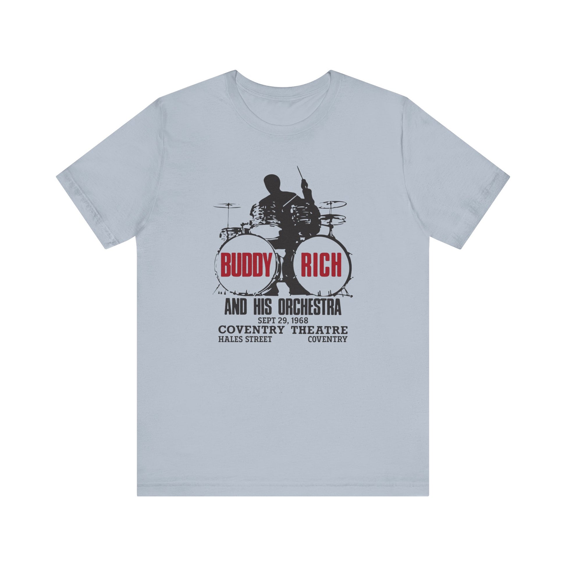 Our Buddy Rich t-shirt commemorates a 1968 UK concert by the great jazz drummer. Printed on our super soft and fantastically comfortable combed and ring spun cotton tees.