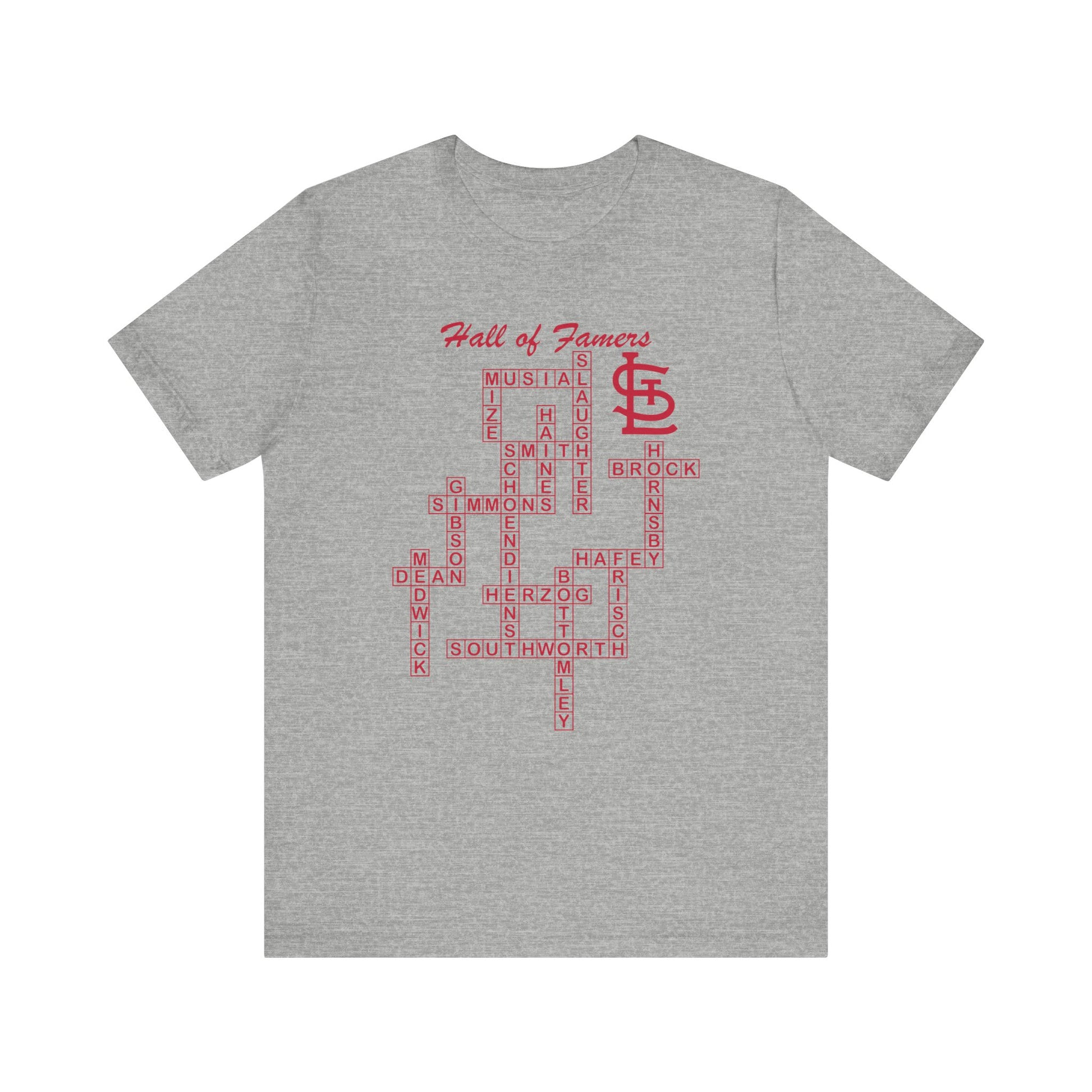 Here's the entire list of players and managers who entered the Baseball Hall of Fame as St. Louis Cardinals. They're all connected in a cool crossword pattern. Printed on our super soft and extremely comfortable combed and ring spun cotton tees.