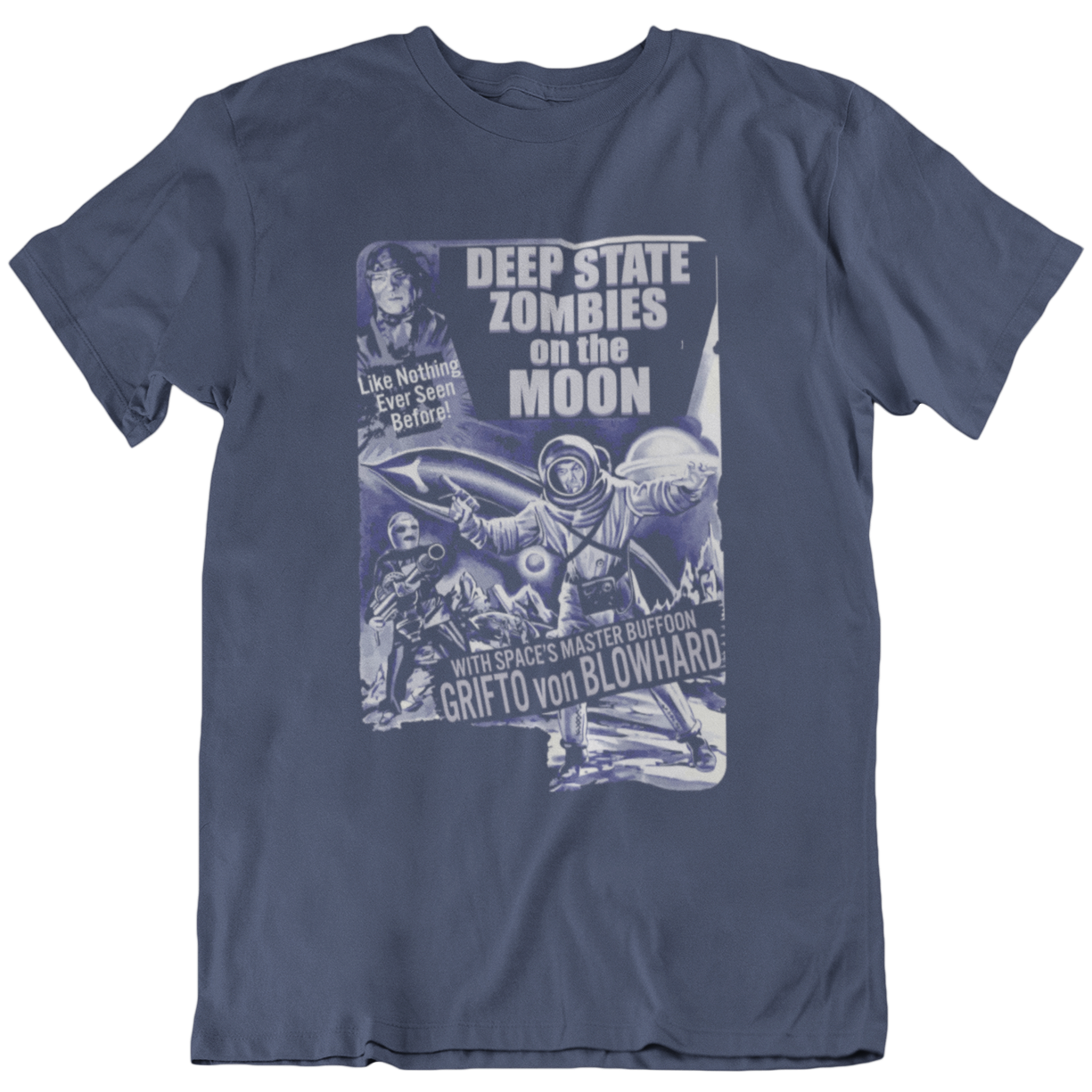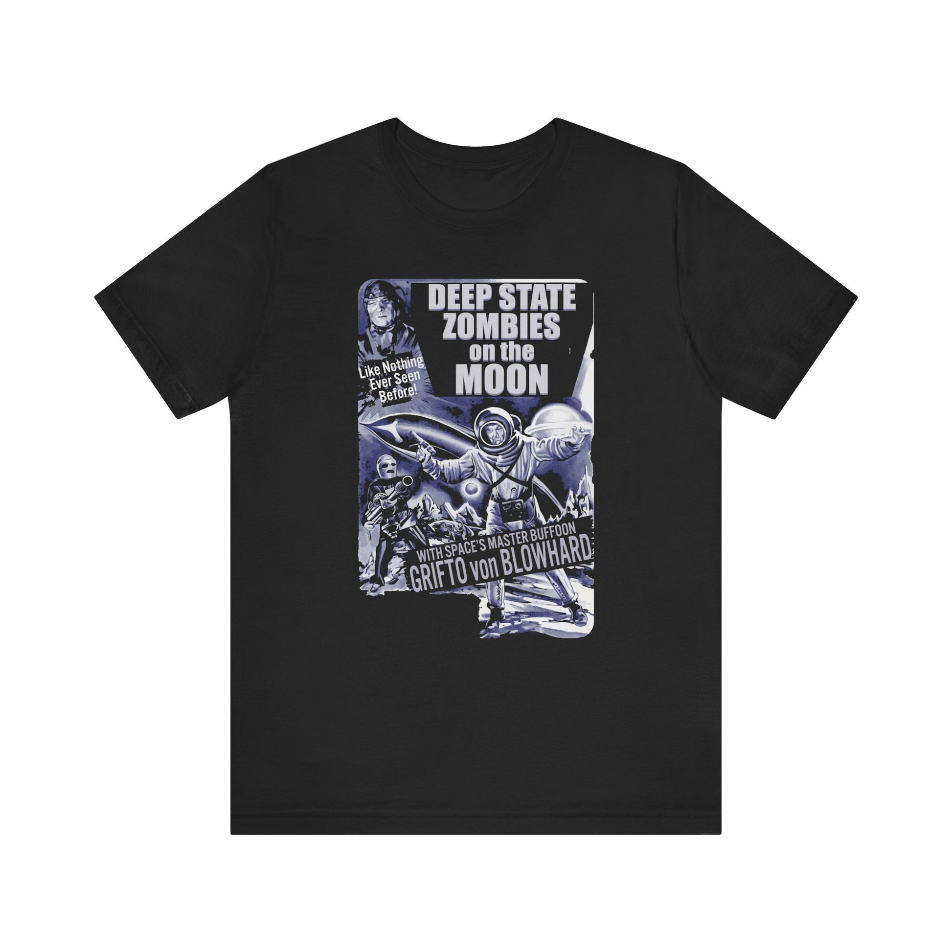 We repurposed an old space movie poster for our Deep State Zombies on the Moon tee design. For political science fiction fans. Printed on our super soft and comfortable combed and ring spun cotton tees.