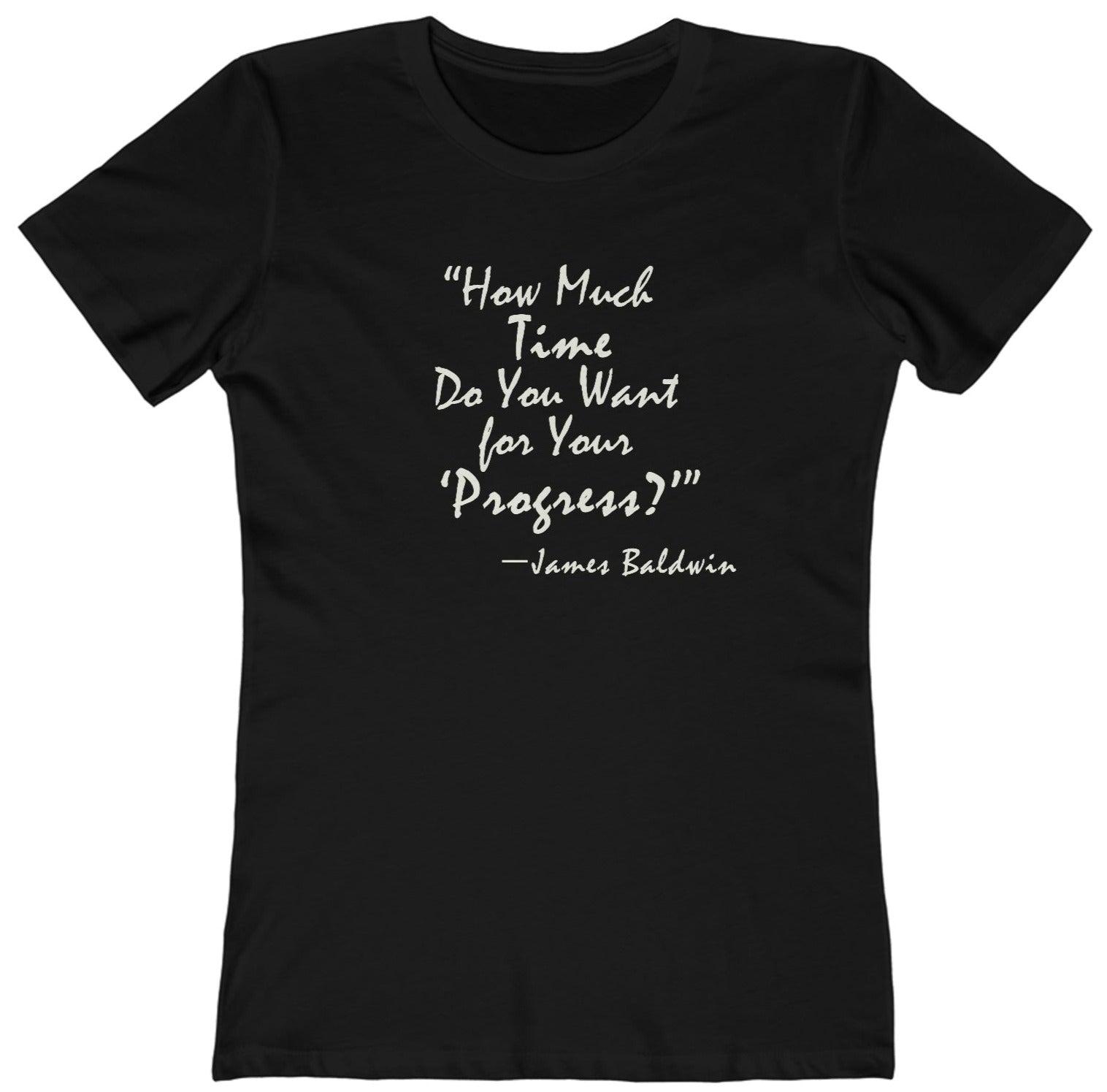 Our James Baldwin t-shirt quotes the author's response in an interview regarding the comment that racial progress takes time. "What is it you wanted me to reconcile myself to? I was born here, almost 60 years ago. I'm not going to live another 60 years. You always told me 'It takes time.' It's taken my father's time, my mother's time, my uncle's time, my brothers' and my sisters' time, my nieces' and my nephews' time. How much time do you want for your progress?"