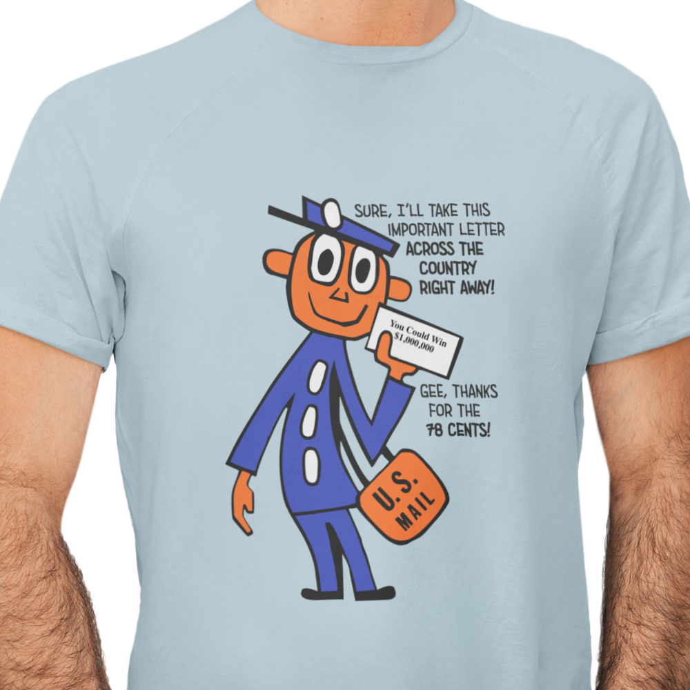 We took an old image of Mr Zip, from when the zip code was introduced, for our comic mailman tee. Printed on our incredibly soft and amazingly comfortable combed and ring spun cotton tees.