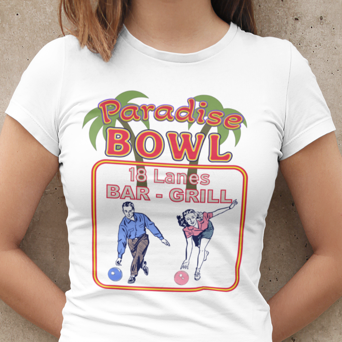 Our Paradise Bowl t-shirt is a throwback to the 1960's bowling boom, when the local bowling alley was THE place for fun and recreation.