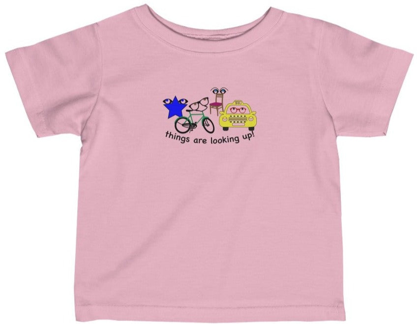 Our Things Are Looking Up design is a super fun expression for your little one's tee. All of our designs are printed directly into the fabric, so the image stays as soft and smooth as the garment itself.