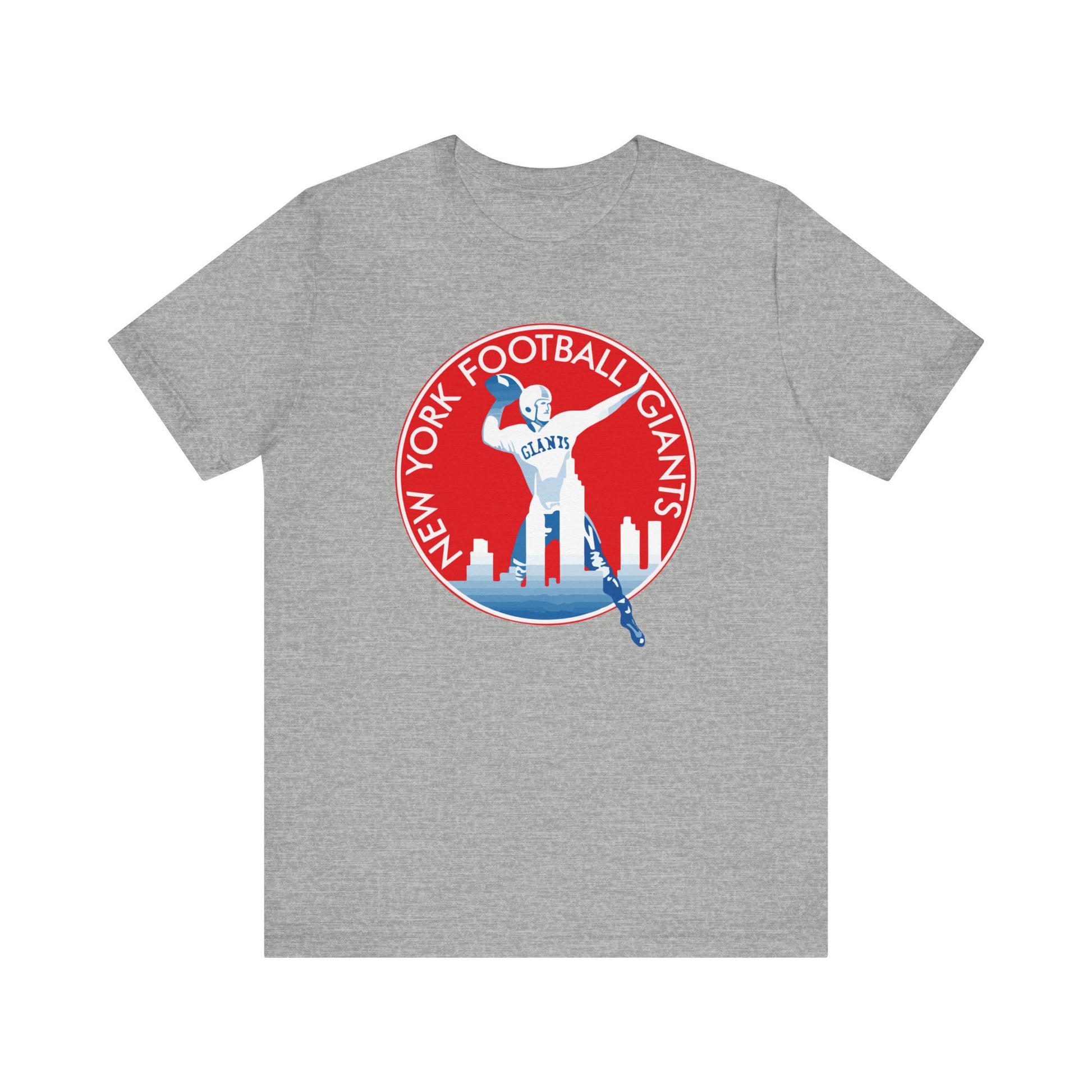 The old New York Football Giants logo from when there was a baseball Giants, too. A great image of the NYC skyline dwarfed by the quarterback. Printed on our super soft and ridiculously comfortable combed and ring spun cotton tees.