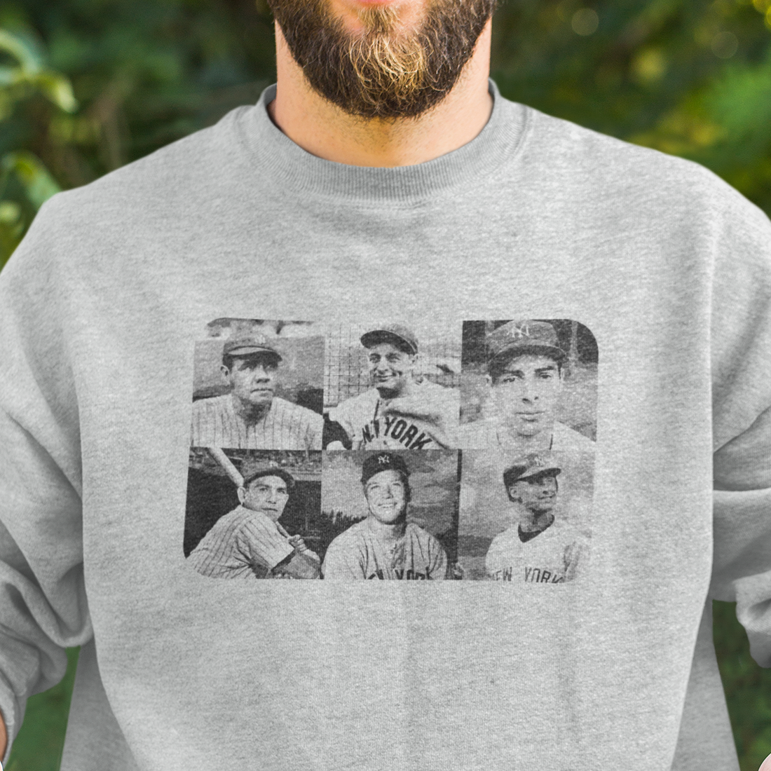 Our Yankee legends sweatshirt honors the six most legendary of all the Yankee greats: Babe Ruth, Lou Gehrig, Joe DiMaggio, Yogi Berra, Mickey Mantle and Derek Jeter, winners of a collective 45 World Series championships! All in grey tones with a unique use of negative space.